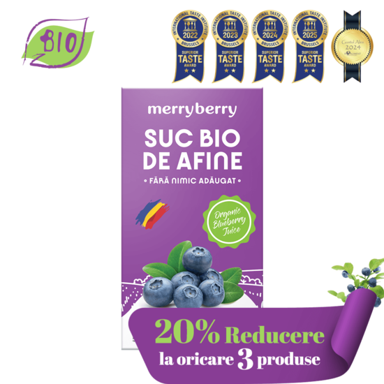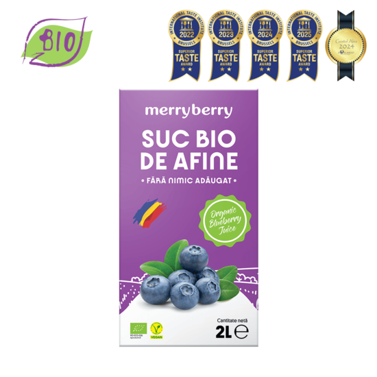 Din recolta noastră de afine BIO proaspete și sănătoase am obținut un suc răcoritor și plin de beneficii pentru sănătate, care se potrivește perfect unei diete bazate pe vitamine și minerale esențiale organismului.